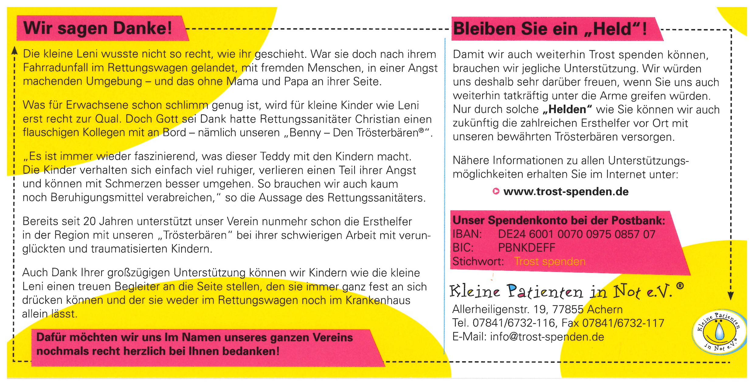 Da die Kosten für diese wertvollen „Trostspender“ weder von den Krankenkassen noch von öffentlichen Trägern übernommen werden, ist der Verein ausnahmslos auf die Mithilfe von Sponsoren und Spendern angewiesen.
